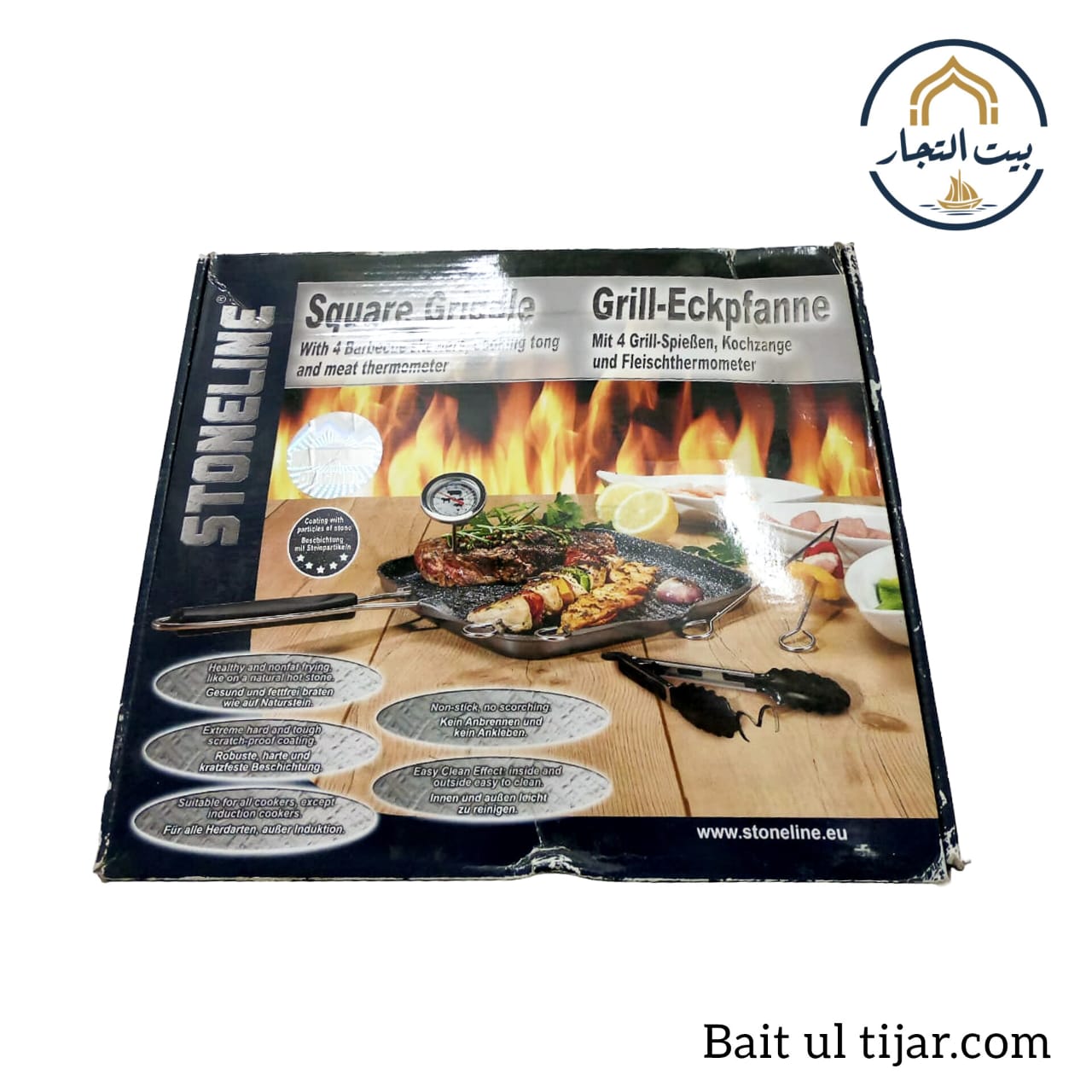 This large square grill pan comes in a complete set, including four barbecue skewers, cooking tongs, and a meat thermometer. It features the STONELINE brand’s signature stone-derived non-stick coating.