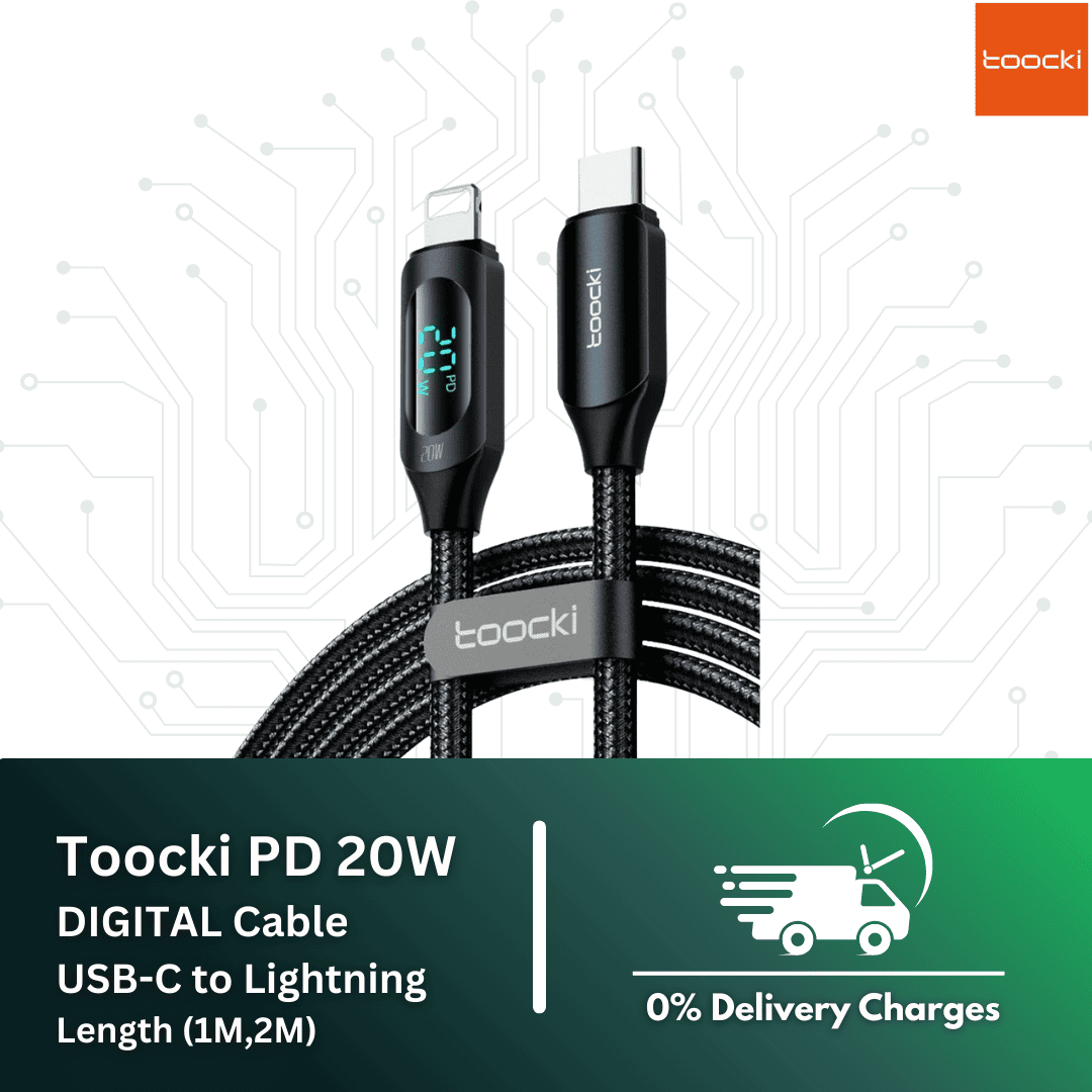 The Toocki PD 20W Digital Cable is a high-speed USB-C to Lightning charging cable designed for Apple devices, supporting Power Delivery (PD) fast charging. With a built-in digital power display, you can monitor the real-time charging wattage, ensuring your iPhone or iPad charges safely and efficiently.