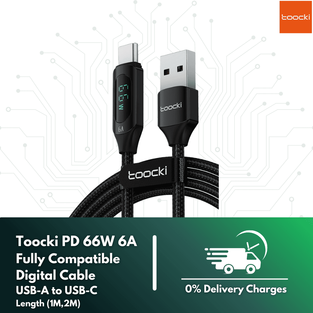 The Toocki PD 66W 6A Fully Compatible Digital Cable is a high-performance USB-A to USB-C charging cable designed for ultra-fast power delivery and stable data transfer. Equipped with a real-time digital display, it shows the current charging power, allowing you to monitor charging speed instantly.